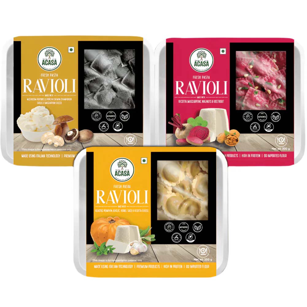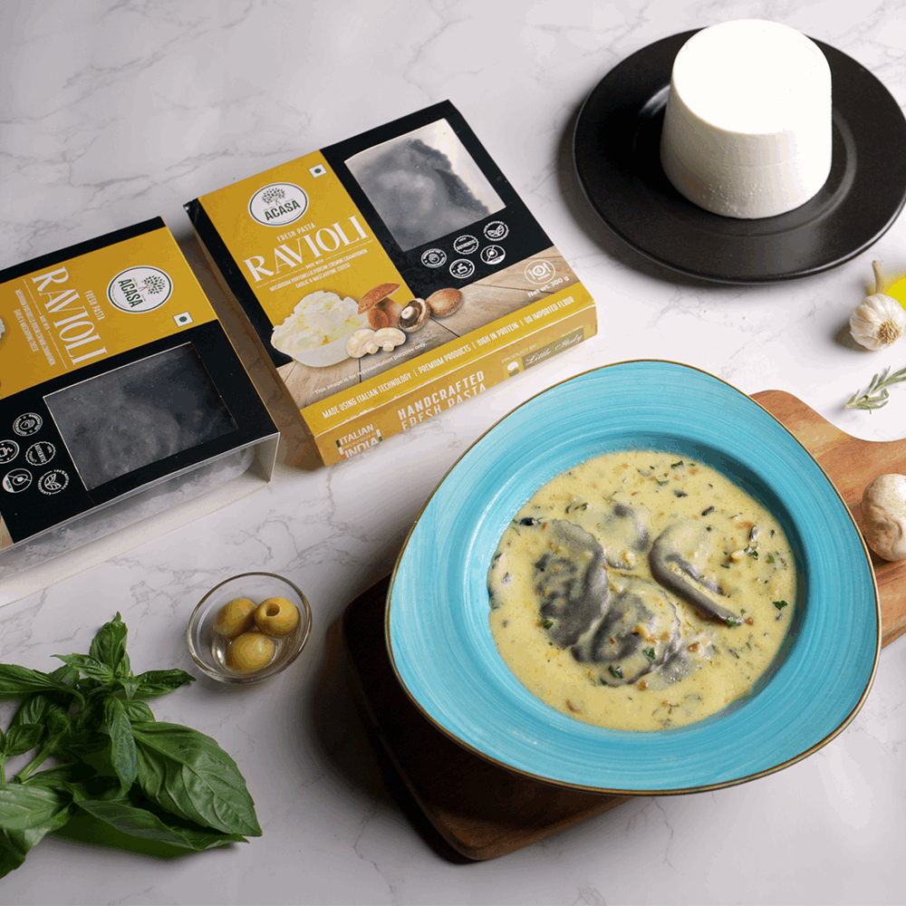 Mushroom Ravioli (200gm): Unleash your senses with Acasa's flavorful mushroom ravioli: a culinary symphony of portobello, porcini, cremini, and champignon mushrooms, intertwined with the rich notes of garlic and cheese.
