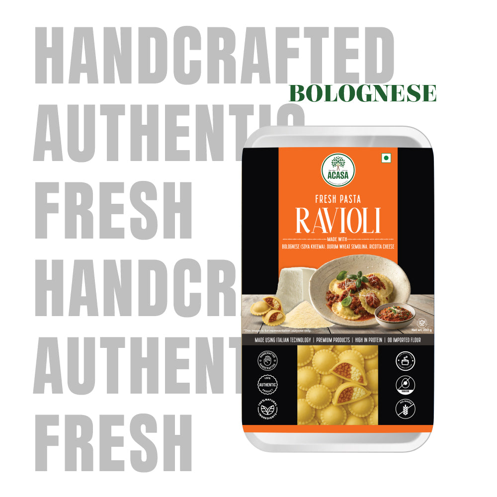 Dive into classic Italian comfort with Acasa’s Bolognese Ravioli: tender pasta parcels filled with a hearty soya kheema Bolognese, simmered with tomatoes and aromatic herbs—crafted to satisfy every craving.