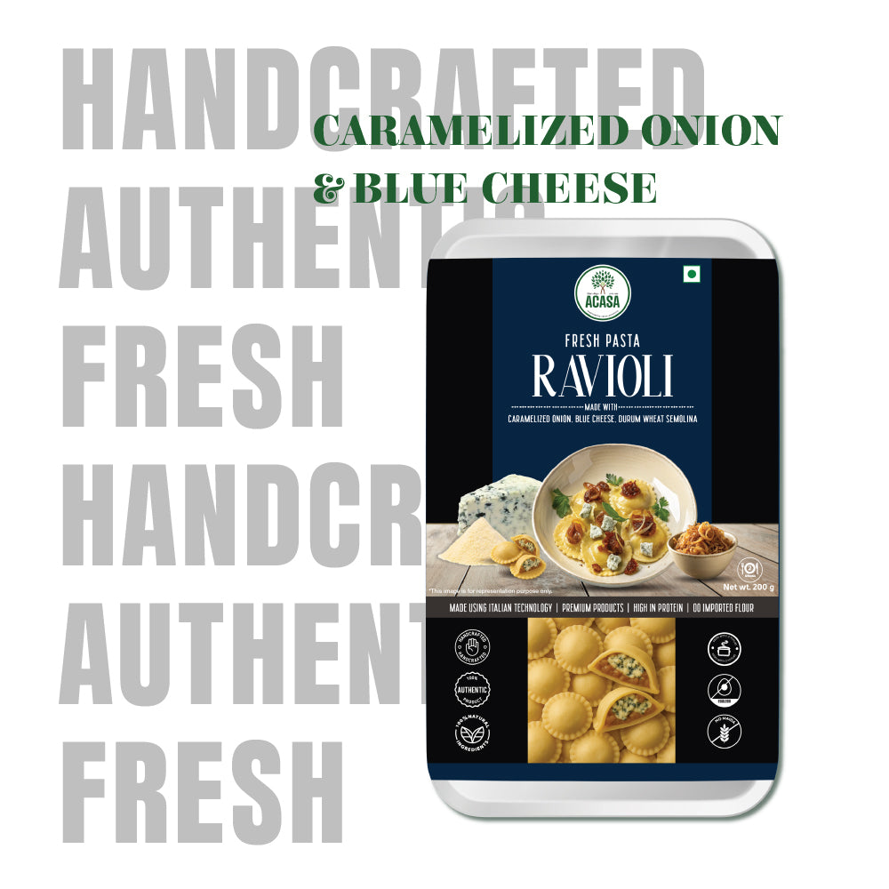 Indulge in the bold elegance of Acasa’s Blue Cheese & Caramelised Onion Ravioli: handcrafted with creamy blue cheese, balanced by the natural sweetness of slow-caramelized onions—a perfect harmony of rich and savory notes.