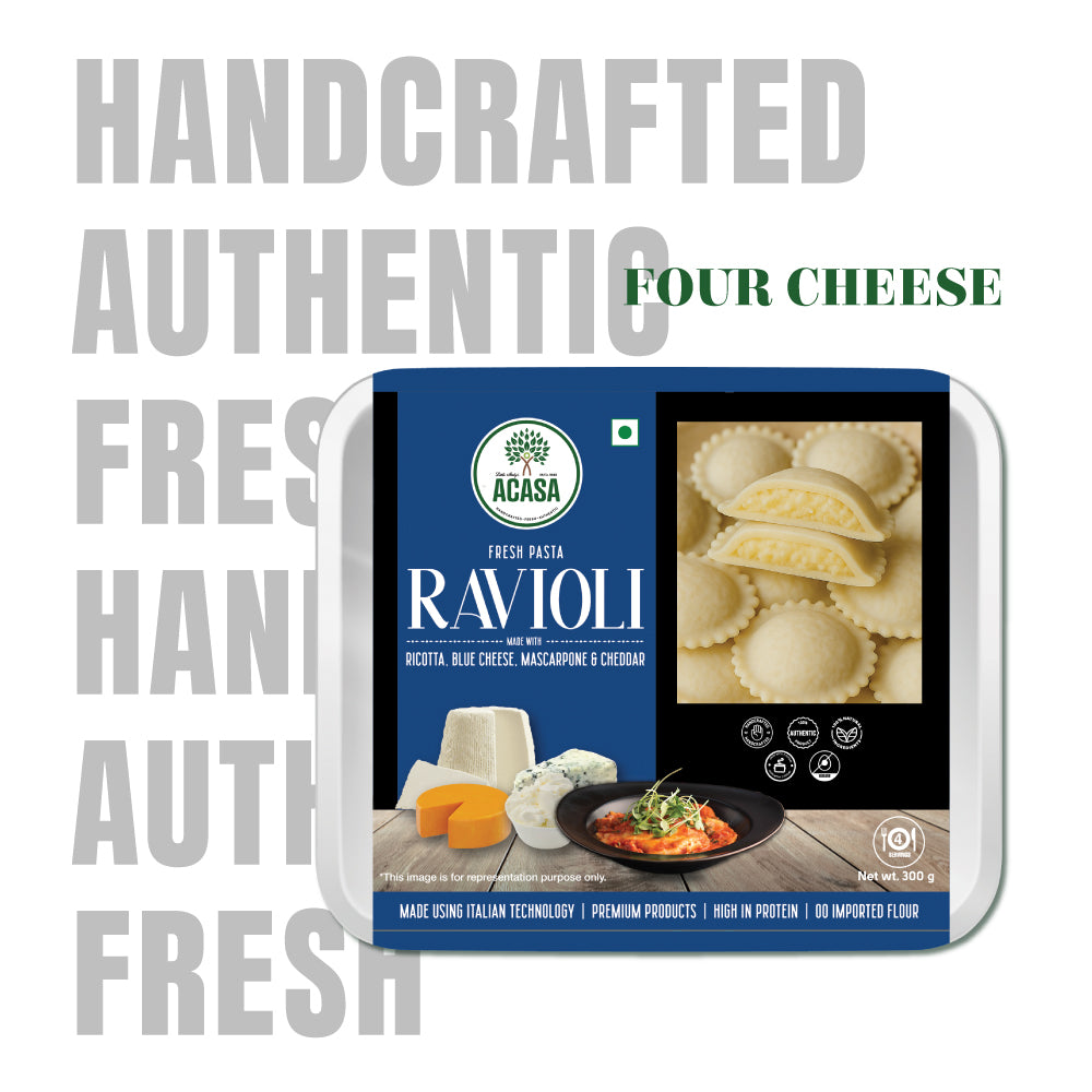 Indulge in a symphony of flavors with Acasa's heavenly ravioli: ricotta, blue cheese, mascarpone, and cheddar unite for a pasta experience like no other!