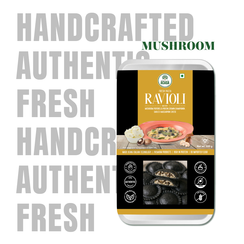 Unleash your senses with Acasa's flavorful mushroom ravioli: a culinary symphony of portobello, porcini, cremini, and champignon mushrooms, intertwined with the rich notes of garlic and cheese.