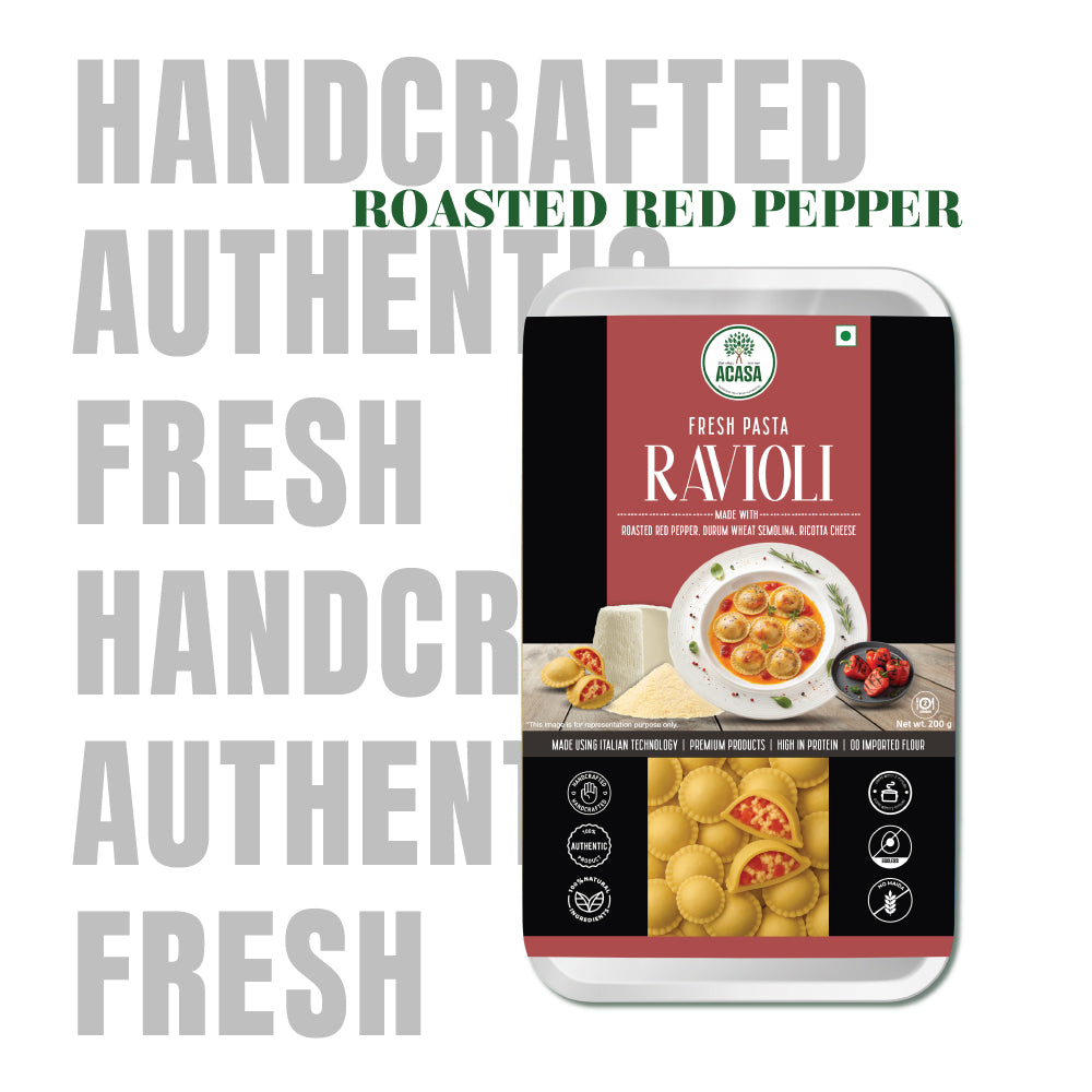 Savor the smoky charm of Acasa’s Roasted Pepper & Cheese Ravioli: vibrant bell peppers roasted to perfection, blended with smooth cheese for a delightfully balanced filling that bursts with flavor.