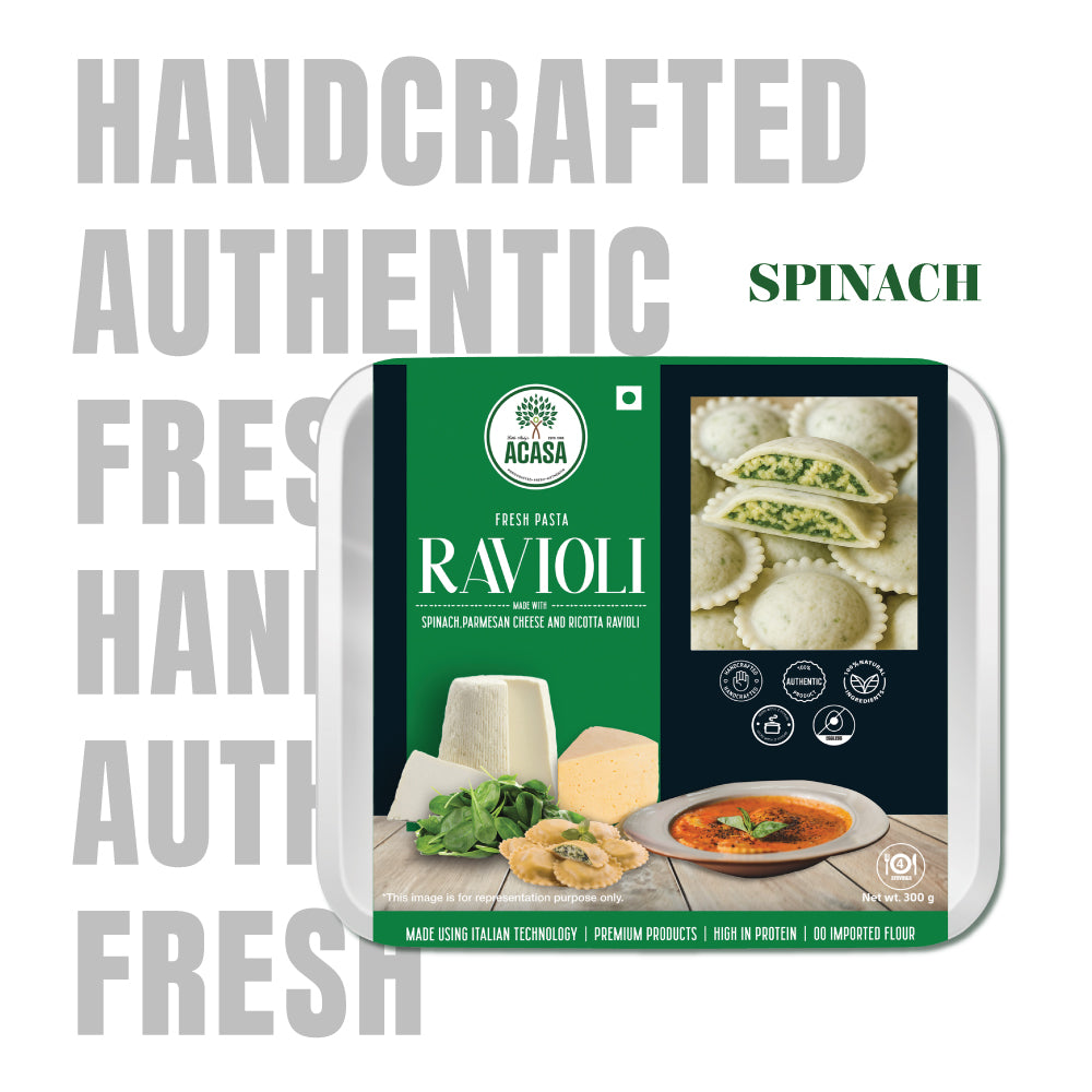 Delight in the green goodness of Acasa's spinach-filled ravioli: crafted with care using farm-fresh spinach, grated Parmesan, and velvety ricotta—a true ode to nature's bounty.