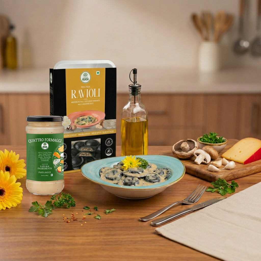 Unleash your senses with Acasa's flavorful mushroom ravioli: a culinary symphony of portobello, porcini, cremini, and champignon mushrooms, intertwined with the rich notes of garlic and cheese.