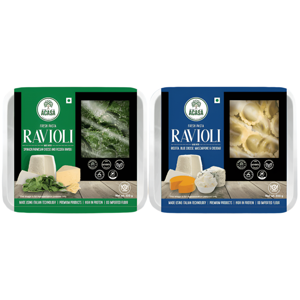Four Cheese Ravioli 300gm: Indulge in a symphony of flavors with Acasa's heavenly ravioli: ricotta, blue cheese, mascarpone, and cheddar unite for a pasta experience like no other!